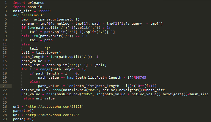 如果hash表中,当每个节点储存的是一个str形式的具体URL,是非常占用内存的,如果把这个URL进行压缩成一个int型变量,内存占用程度上便有了3倍以上的缩小。因此可以利用Python的hashlib模块来进行URL压缩。 思路:把hash表的节点的数据结构设置为集合,集合内储存压缩后的URL。