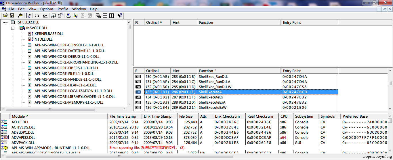 图:Dependency Walker显示的ShellExecuteA导出函数的偏移量。用该值加上DLL的 Image Base即可得到本机适用的函数地址(无ASLR情况下)。