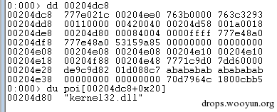 所以上述代码就在不断寻找kernel32.dll的地址,edx+8就是地址,edx+20h则为函数名字,ASCII 0x33是字符”3”,因此它在比较第7个字(0xC == 12 (dec))是否为“3”,因为这些按顺序加载的模块也就kernel32在第七个字上是3了,所以这个还是比较准的。