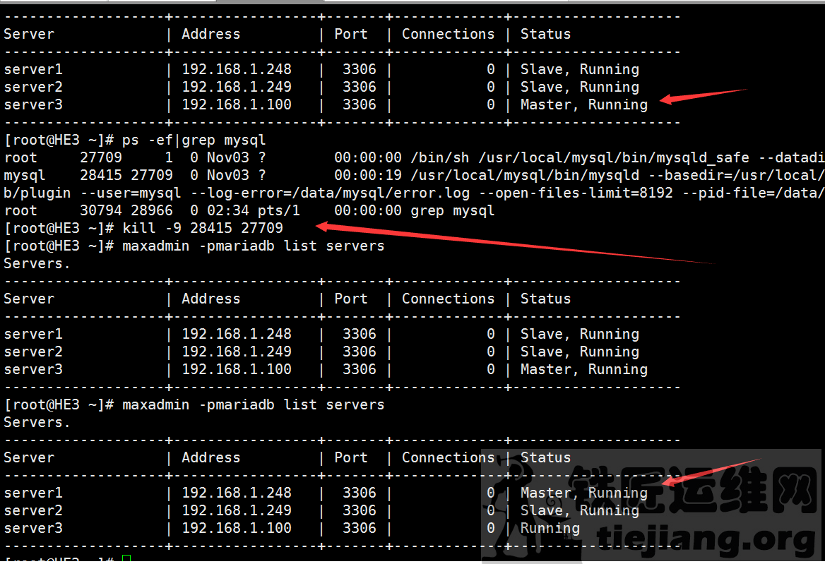 [root@HE3 ~]# maxadmin -pmariadb list servers Servers. -------------------+-----------------+-------+-------------+-------------------- Server | Address | Port | Connections | Status -------------------+-----------------+-------+-------------+-------------------- server1 | 192.168.1.248 | 3306 | 0 | Slave, Running server2 | 192.168.1.249 | 3306 | 0 | Slave, Running server3 | 192.168.1.100 | 3306 | 0 | Master, Running -------------------+-----------------+-------+-------------+-------------------- [root@HE3 ~]# ps -ef|grep mysql root 27709 1 0 Nov03 ? 00:00:00 /bin/sh /usr/local/mysql/bin/mysqld_safe --datadir=/data/mysql --pid-file=/data/mysql/HE3.pid mysql 28415 27709 0 Nov03 ? 00:00:19 /usr/local/mysql/bin/mysqld --basedir=/usr/local/mysql --datadir=/data/mysql --plugin-dir=/usr/local/mysql/lib/plugin --user=mysql --log-error=/data/mysql/error.log --open-files-limit=8192 --pid-file=/data/mysql/HE3.pid --socket=/tmp/mysql.sock --port=3306 root 30794 28966 0 02:34 pts/1 00:00:00 grep mysql [root@HE3 ~]# kill -9 28415 27709 [root@HE3 ~]# maxadmin -pmariadb list servers Servers. -------------------+-----------------+-------+-------------+-------------------- Server | Address | Port | Connections | Status -------------------+-----------------+-------+-------------+-------------------- server1 | 192.168.1.248 | 3306 | 0 | Slave, Running server2 | 192.168.1.249 | 3306 | 0 | Slave, Running server3 | 192.168.1.100 | 3306 | 0 | Master, Running -------------------+-----------------+-------+-------------+-------------------- [root@HE3 ~]# maxadmin -pmariadb list servers Servers. -------------------+-----------------+-------+-------------+-------------------- Server | Address | Port | Connections | Status -------------------+-----------------+-------+-------------+-------------------- server1 | 192.168.1.248 | 3306 | 0 | Master, Running server2 | 192.168.1.249 | 3306 | 0 | Slave, Running server3 | 192.168.1.100 | 3306 | 0 | Running -------------------+-----------------+-------+-------------+--------------------