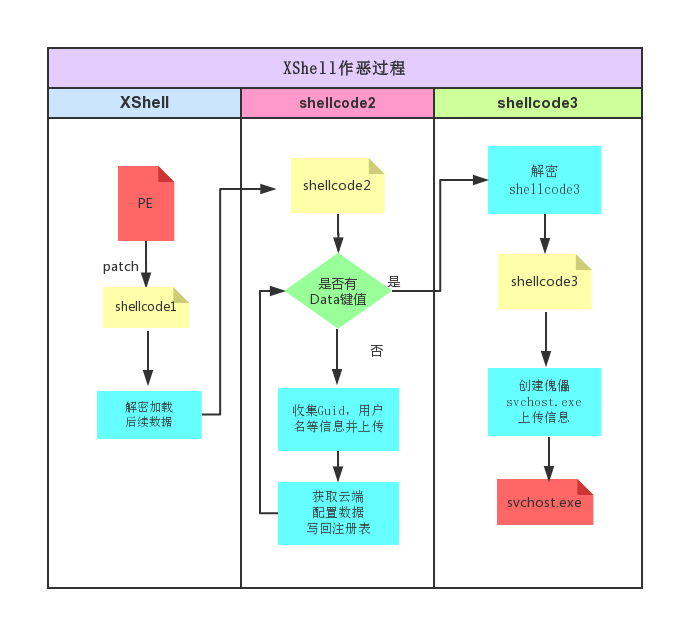 整个作恶过程分为3部分,第一部分是被patch的XShell启动后,执行到恶意的shellcode1。shellcode1解密后续数据后,执行该段代码shellcode2。第二部分shellcode2运行后会判断注册表项,如果不存在Data键值,则会收集用户信息,通过DNS 协议传走,并获取云端配置数据写回到注册表。第三部分,如果注册表项中有该键值,则会开始执行后续的恶意行为,通过注册表中的key来解密出shellcode3,最终会创建svchost进程,并盗取主机信息。下面我们就分别介绍一下各个过程。