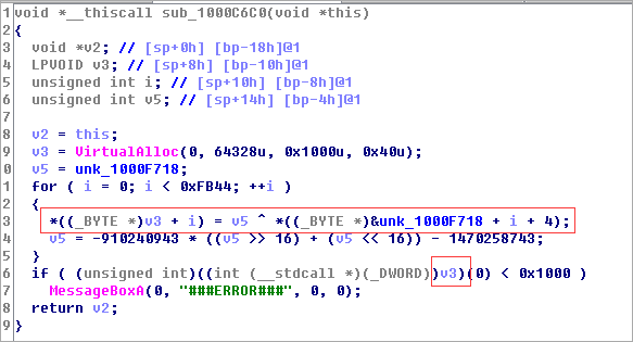 Xshell.exe启动后会调用自己的nssock2.dll,在sub_1000c6c0函数出,调用VirtualAlloc申请一段内存后,解密数据赋值到这段内存后,调用并执行。