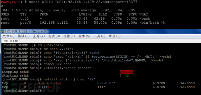 # socat STDIO TCP4:192.168.1.129:22,sourceport=13377