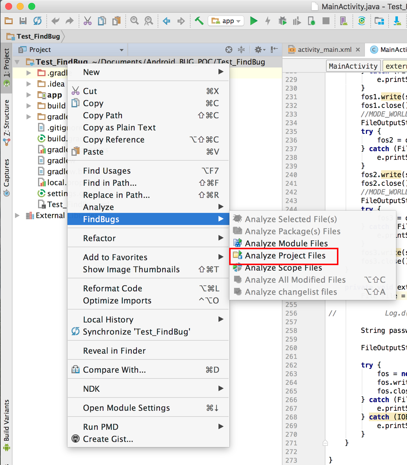 完成安装后就可以开始扫描了,右键点击待扫描项目,在出现的复选框中找到FindBugs,在弹出的选项中选择Analyze Project Files,此时FindBugs便会自动开始对项目进行扫描了,扫描的步骤如下图所示。