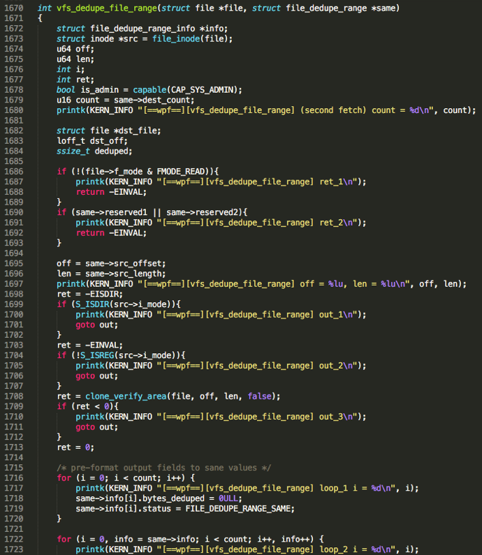 ioctl_file_dedupe_range()负责检查这些destination sections和source section 是否完全一致,如果一致,则free掉destination section,并将source section映射到对应的destination file。其中bytes_depued代表成功匹配并被释放的字节数,status存储了操作结束后的状态码。