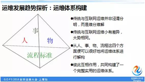 以面向服务、持续交付为核心,从人、事、物、流程这四个方面把运维体系进行解构,它们彼此互相作用,共同构建了一个完整实用的运维体系。