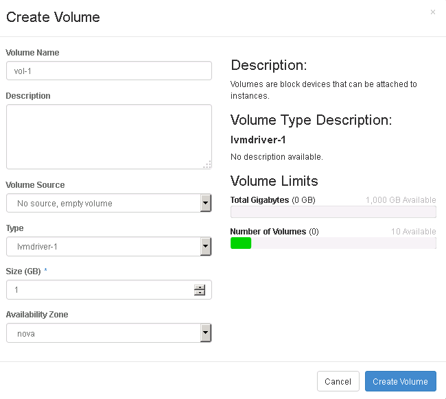 设置 volume 的名称,volume type,大小,Availability Zone 等基本信息。
