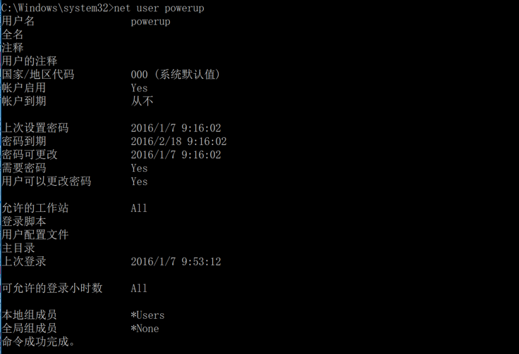#!bash C:\Windows\system32>net user powerup 1 /add