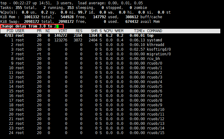 top - 14:58:34 up 5:28, 1 user, load average: 0.01, 0.02, 0.05