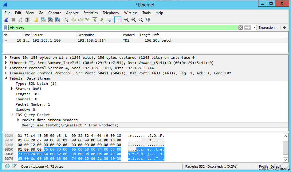 登陆后,我在 MSSQL 服务器上打开 Wireshark 2.0,开始抓包。我用 “tds.query” 的 filter 在 Wireshark 上过滤,这样就可以隐藏其他乱七八糟的流量,仅现实 TDS 查询包了。(顺便一提啊,我发现“tds.query” filter 在老版本的 Wireshark 上不受支持)