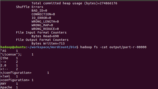 $ cd ~/workspace/WordCount/bin //进入到WordCount.jar所在目录 $ hadoop jar WordCount.jar test.WordCount input output $ hadoop fs -cat output/part-r-00000 //查看输出